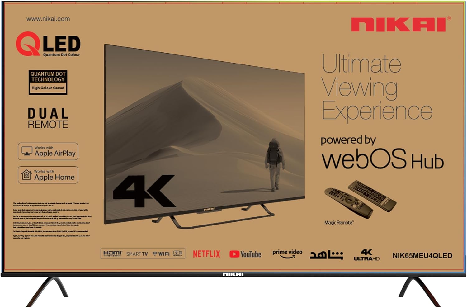 يتميز تلفزيون نيكاي الذكي QLED LED مقاس 65 بوصة بإطار معدني أسود أنيق وحامل، مما يوفر دقة شاشة مذهلة تبلغ 3840×2160 (4K).